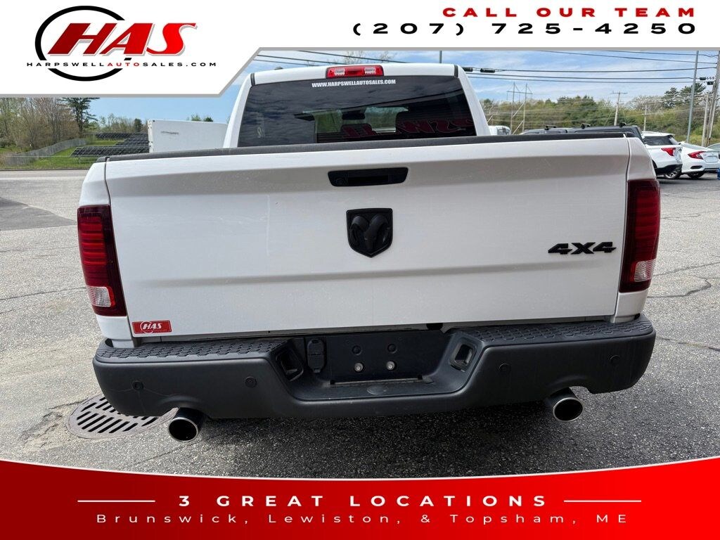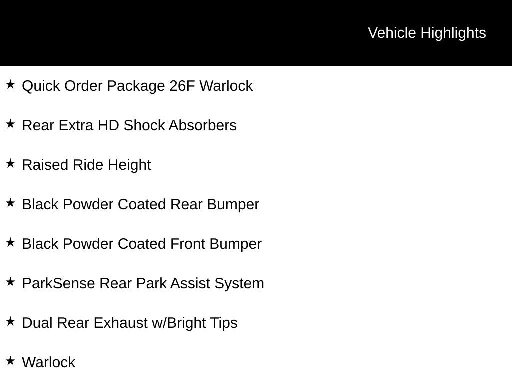 Bright White Clearcoat 2021 Ram 1500 Classic Warlock 4WD 8-Speed Automatic HEMI 5.7L V8 Multi Displacement VVT 4x4 Flat Black Badge, Bi-Function Halogen Projector Headlamps, Black Door Handles, Black Exterior Truck Badging, Black Grille w/RAM Lettering, Black Headlamp Filler Panel, Black Powder Coated Front Bumper, Black Powder Coated Rear Bumper, Black RAM Head Tailgate Badge, Black Wheel Flares, Dual Rear Exhaust w/Bright Tips, Front Wheel Well Liners, ParkSense Rear Park Assist System, Quick Order Package 26F Warlock, Raised Ride Height, Rear Extra HD Shock Absorbers, Semi-Gloss Black Hub, Sport Tail Lamps, Warlock, Warlock Interior Accents, Wheels: 20" x 9" Semi-Gloss Black Aluminum.